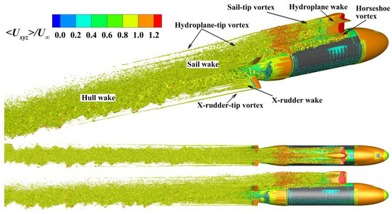 Figure 12 presents an overall view of the flow past Joubert BB2 under straight-ahead conditions in terms of the second invariant of the velocity gradient Q, colored by the mean resultant velocity . At the immediate front of the junctions of the sail root and the deck, the flow rolls up into a horseshoe vortex system surrounding the sail, the legs of which develop downstream following the deck. Because of the adverse pressure gradient at the trailing edge of the sail, the flow gradually develops into turbulence, and the side vortices are formed and interact with the horseshoe vortex at the root. The side vortices over the sail cap are transported along the sail edge and then merge with the sail-tip vortices and dissipate rapidly. The flow over the outer edge of the hydroplanes induces a pair of hydroplane-tip vortices with opposite circulation, which develop downstream independently, then dissipates and disappears at a distance of approximately one submarine length from the stern. Further, horseshoe vortex, tip vortex, and wake vortex systems can be observed around the X-rudders. Between the two upper rudders, they interact with the vortices sweeping down and sideways over the end of the deck, complicating the flow into the propeller disk, which is unstable and the main source of propeller hydrodynamic noise. Downstream, far away from the hull, all the tip vortices dissipate and really only the wake vortices, after complicated interaction, dynamically evolve, with the energy gradually weakening.