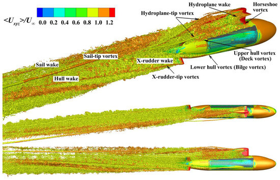 Submarines will generate vortex structures with various scales and forms that develop downstream during navigation. Generalized appendages, such as sails, hydroplanes, rudders, decks, and flood holes, create coherent vortex structures, like the horseshoe vortex, tip vortex, Karman vortex, discrete vortex, etc., leading to intense flow vibration. The development of these vortex structures also influences the maneuverability and deteriorates the wake of the platform. The vortex oscillation and its induced pressure fluctuation excite the hull, resulting in flow-induced noise, which seriously influences the stealth [1,2,3]. The investigation of the flow physics of a submarine can help us to better understand maneuverability limitations and flow-induced noise sources.