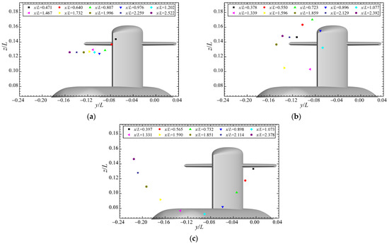 Similarly, Figure 13 presents various vortex systems past Joubert BB2 under 10° yaw conditions, from perspectives of oblique, top, and side views. It can be clearly seen that the vortex systems are more complicated. The side vortices on the leeward side of the sail occur further forward, and the sail-tip vortices are relatively strong enough to develop far downstream. The same is true for the hydroplane-tip vortices, but they are not clearly observed downstream because of strong interactions with the sail wake. Figure 14 shows the development of the trajectories of the cores of tip vortices originating from the cruciform appendage, including the port and starboard hydroplanes and the vertical sail, under 10° yaw conditions. Referring to Akkermans’s work [46], tip vortex tracking under 10° yaw conditions exhibits significant three-dimensional characteristics as the wake develops downstream. The clockwise rotating sail-tip vortices maintain an axial angle of approximately 8 degrees with the hull and develop downstream and leeward, and are almost stable vertically after experiencing a brief downwash immediately behind the sail. The position of the port hydroplane-tip vortices fluctuates widely, the horizontal and vertical coordinates of which reach their maximum values approximately at x/L = 1.1 and x/L = 0.7, respectively, and then experience a sharp drop. Overall, the port hydroplane-tip vortices develop and revolve around the sail-tip vortices. The development of the starboard hydroplane-tip vortices is relatively stable, and their core keeps moving towards the leeward side, with the vertical position gradually rising away from the hull after passing through a valley at approximately x/L = 1.1, due to the repulsive interaction of the hull wake.