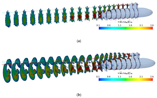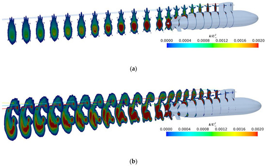 Figure 16 shows the evolution of the turbulence kinetic energy along the submarine axial, under straight-ahead and 10° yaw conditions. The evolution of TKE is quite similar to that of the mean vorticity magnitude, where the vorticity is concentrated, the momentum is intense, and the TKE is significant. For the case with 10° yaw, it can be obviously seen that the TKE induced by the sail-tip vortices is stronger than that induced by the hydroplane-tip, with the same pattern as the vorticity followed. In addition, the TKE in the wake is strongly influenced by the X-rudder under both conditions, which exacerbates the velocity fluctuations of the flow and induces additional propeller noise; thus, the hydrodynamic design of the X-rudder is also a research highlight.