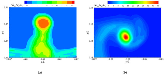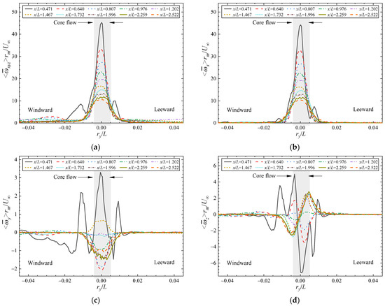 Figure 21 shows a comparison of the mean vorticity under different streamwise locations. The dominant component of the mean vorticity magnitude is the streamwise mean vorticity , which indicates that the sail-tip vortex rotates rather faster around the x-axis compared to the other two. The core-flow vorticity weakens rapidly as the wake develops downstream, while the decay rate gradually slows down. An interesting phenomenon shows that the distribution of the peaks and valleys of the vertical mean vorticity changes with the evolution of the flow. In the near wake region, where x/L ≤ 0.807, the peaks are located on the windward side and the valleys are located on the leeward side, while in the far wake region, the positions of the two are exactly opposite.