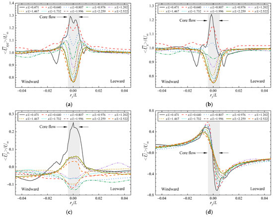 In view of the fact that the momentum and energy transported by the sail-tip vortices under 10° yaw conditions were predominant, the flow characteristics of the sail-tip vortices are further studied below. Figure 20 provides a comparison of the velocity for the sail-tip vortex under different longitudinal locations, including mean resultant velocity and the three-dimensional component of velocity , , and . It can be seen intuitively that, as the wake of the sail-tip vortices develops downstream, the mean resultant velocity, streamwise velocity, and horizontal velocity show a gradually decreasing trend, and the fluctuation of the vertical velocity between peak and valley values gradually weakens. In the near-wake region, where x/L ≤ 0.807, the core flow exhibits a high-velocity characteristic, while in the far-wake region, the velocity is smaller than the freestream velocity.