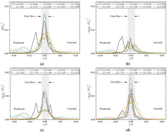 Figure 22 shows a comparison of the turbulence kinetic energy under different streamwise locations. The roll-up from the sail is accompanied by a downwash of the sail-tip vortex (see Figure 14a), and the normal stress in the vertical component <uxux> is the strongest contribution to the TKE, as mentioned by Lee [24]. Because of the significant cross-stream, the normal stress in the horizontal component accounts for the second strongest contribution, and the normal stress in the streamwise component is the weakest. The strongest TKE does not occur immediately behind the sail, but approximately in the range of x/L equal to 0.6 to 1.0, where the downwash of the sail-tip vortex is quite intense.