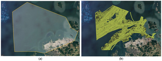 (a) Location polygons for the port area and (b) AIS data plotted on the map layer.