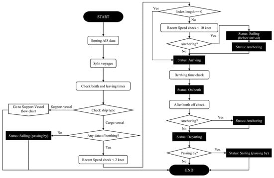 Figure 8 provides an overview of the process for determining the statuses of Merchant Ships. The process begins by sorting the AIS data based on timestamps. Subsequently, the AIS data for each vessel are divided into one or several voyages by identifying when they entered and left the port area. If the vessel is classified as a Merchant Ship, the process continues; otherwise, it is directed to the Supporting Ship algorithm. If a voyage has no history of berthing, all statuses for that voyage are labeled as ‘Sailing (passing by)’. To make this determination, the Port-MIS report is utilized. If a vessel berthed during the voyage, the algorithm checks whether the vessel weighed anchor, the time it berthed, the time it departed from the port, and whether it anchored again after leaving the berth. The specific algorithm for this process is detailed in Algorithm A1 in Appendix A.