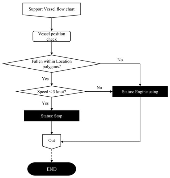 Figure 9 illustrates an overview of the process for determining the statuses of Supporting Ships. These are vessels identified as Supporting Ships in Algorithm A1. If the algorithm detects that the vessel’s position falls within any of the location polygons in and its speed is below 3 knots, the voyage’s status is set as ‘Engine stop’. Otherwise, if the position is outside the polygons or the speed is above 3 knots, the status is designated as ‘Engine using’. The specific algorithm for this process is described in Algorithm A2 in Appendix A.