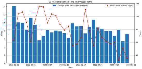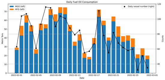 The AIS data used in this research, collected in February 2022, consisted of 3,152,360 rows. Since AIS data is typically updated and recorded in seconds, it provides valuable insights into vessel traffic by tracking and monitoring the changes in vessel positions and speeds within a port area. We utilized this data to categorize the statuses of vessels based on the ways in which they consume fuel oil differently, aiding in the calculation of the total emissions emitted by vessels. Details on the description and algorithms used to define these statuses are presented in Section 2.3.