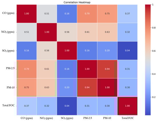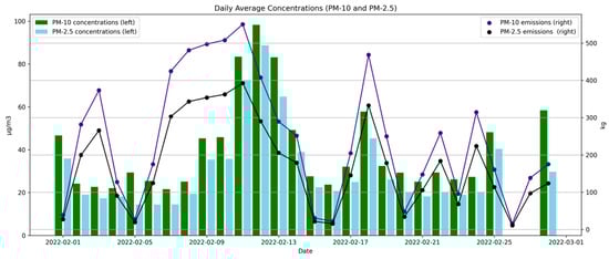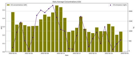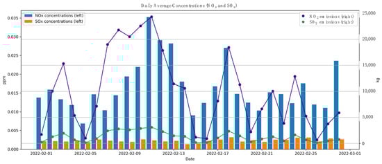 The air pollutant emission measurement data was obtained from ‘Air Korea’ [38], operated by the Ministry of Environment. This platform shares real-time air pollutant emission data with the public for research purposes, providing daily hourly-based measurements of various harmful pollutants, including sulfur dioxide (SO2), carbon monoxide (CO), nitrogen dioxide (NO2), particulate matter with a diameter of 10 μm or less (PM-10), and particulate matter with a diameter of 2.5 μm or less (PM-2.5). Both particulate matters are created when air pollutants mix with airborne substances. The air pollutant emission data of the port was collected over a one-month period as actual data for comparison with the proposed AIS-based vessel traffic-induced air pollution prediction model.