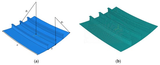 Structural settings of typical doubly curved stiffened plates: (a) geometric model; (b) NFEM model.