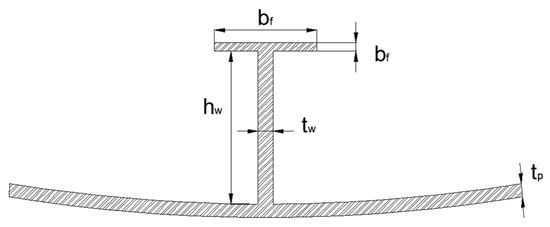 As shown in Figure 1a, a denotes the longitudinal span, b denotes the spacing between adjacent stiffeners, denotes the curvature radius along the stiffeners, and denotes the curvature radius along the direction that is perpendicular to the stiffeners. To illustrate the curvature and its influence on the ultimate strengths, the curvatures in longitudinal and transversal directions of all the models are represented by groups of dimensionless terms and , which are shown in Figure 2. All the stiffeners are equipped with a ‘T’ type section, which is depicted in Figure 3.