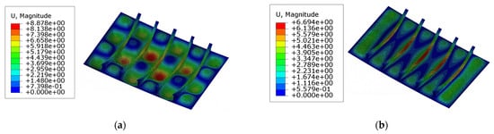The modes’ initial imperfections. (a) Buckling mode; (b) thin horse mode. Scale: 40.