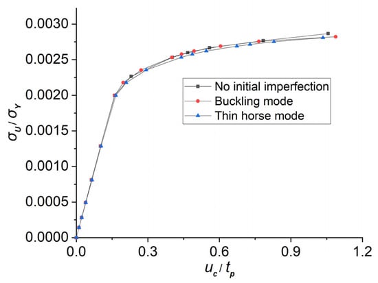 To clarify the influence of initial imperfections on lateral ultimate strengths, a curved stiffened plate with transversal curvature identical to model ‘R5’ is established. The ‘buckling’ mode initial imperfection recommended by ISSC [19] and the ‘thin horse’ mode initial imperfection conducted by Yao et al. [20] are applied to the model, respectively. The modes of the initial deflections are depicted in Figure 4 and Equations (2)–(5). As shown in Figure 5, the lateral strengths of models with different geometrical imperfections are similar. Moreover, the lateral ultimate strength does not significantly decrease with the occurrence of the initial deflections, and the differences in the ultimate strengths between models with and without initial deflection are less than 5%. Consequently, the influence of the initial deflection on lateral ultimate strengths is actually limited. And the results from models without initial imperfections can be considered reasonable.
