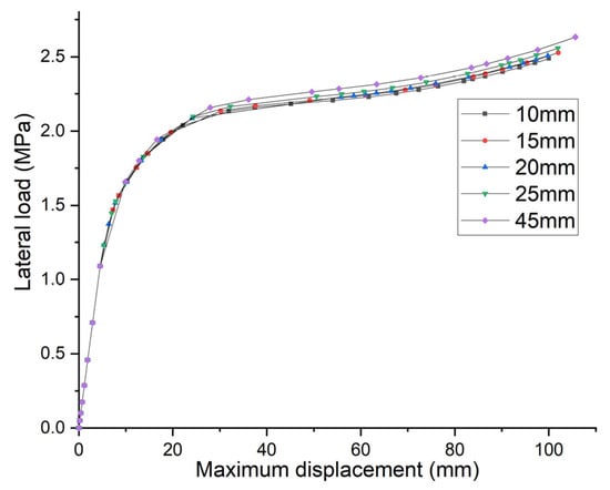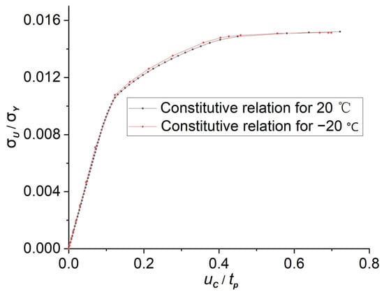 In addition, the influence of low temperature has been considered in this study. Wang et al. [22] conducted a uniaxial tensile experiment on the marine steel selected for this study to investigate the effect of low-temperature conditions on the steel’s properties. The results indicate that low temperature increases the elastic modulus and yielding strength, and the ideal elastic-plastic model is still applicable under these conditions. According to the outcomes of the experiment, the elastic modulus is set as 228,000 MPa and the yielding strength is set as 373 MPa (to simulate the steel at −20 °C). Figure 12 shows the lateral strengths of model ‘R4T1S1’ under 20 °C and −20 °C. The shape difference between the two curves is not significant, while the lateral ultimate strength of the model under −20 °C is higher. And the difference between the two cases is 4.13%. As the temperature selected in the calculation is similar to the actual working conditions of ice breakers, it can be concluded that the lateral ultimate strength of the plates will increase slightly in the actual low-temperature environment. Consequently, results from models employed in this paper are conservative.