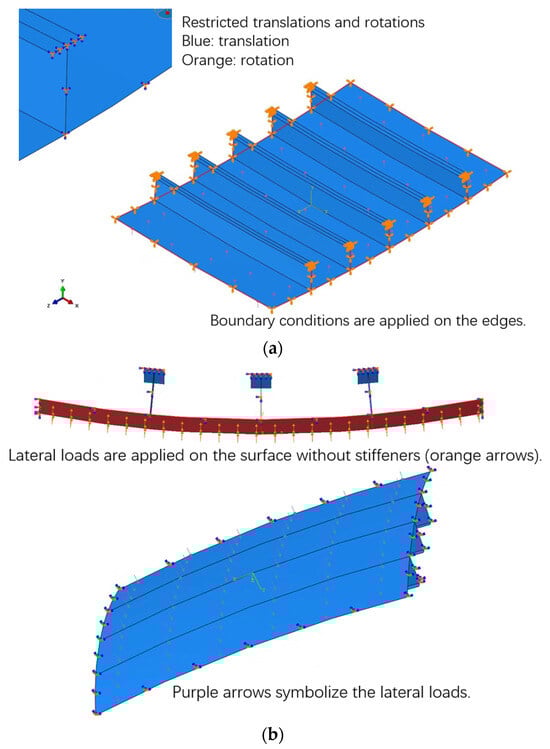 The quantity of longitudinal and transversal primary supporting members in bow or stem structures is generally larger than those in other parts; therefore, doubly curved stiffened plates are subjected to stronger constraints than stiffened plates in other parts. Additionally, the deformations of the shell, when subjected to uniformly distributed lateral loads, are symmetric in longitudinal or transversal direction. Consequently, in the investigation of the lateral ultimate strength of the doubly curved stiffened plates, the clamped constraint is applied on the boundaries of the numerical model, restricting all the translations and rotations. The lateral loads are applied on the outer surface without stiffeners in the form of a uniformly distributed normal load. The settings of load and boundary conditions are shown in Figure 8.