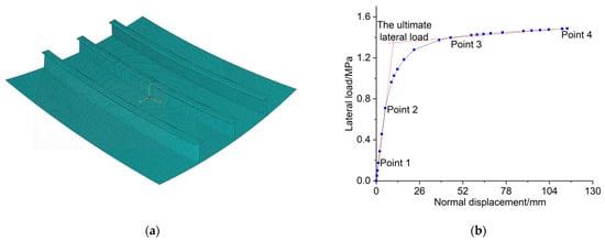 In this study, the lateral ultimate strength of the doubly curved stiffened plate is determined by identifying the lateral load at the inflection point of the lateral load-central displacement curve. The magnitude displacement of the central point is selected as the response of the structure in the lateral loading cases. Figure 9b illustrates the lateral load-magnitude displacement curve for each case, where four points are selected to define two straight lines. These lines represent different parts of the curve; namely, the linear loading stage before buckling occurs and the post-buckling stage with large deformations. The lateral load at the intersection of these lines is considered as the lateral ultimate load, measured in MPa. The lateral ultimate strength and the structural response are normalized by and , respectively, where denotes the yielding stress of the material and denotes the normal displacement of the central point of the model.