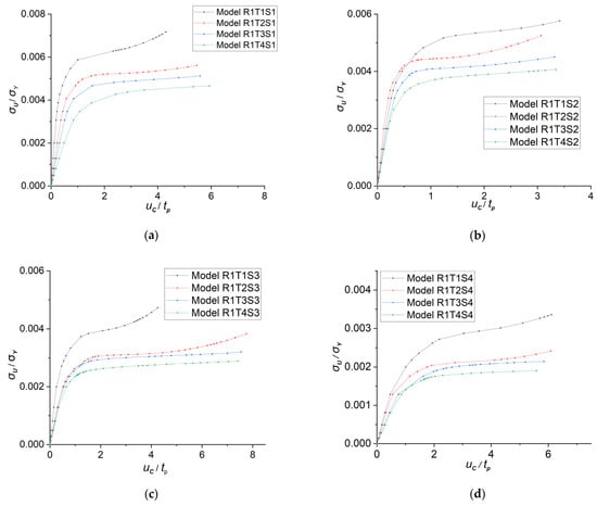 The lateral ultimate strength-displacement curve of model R1. (a) Models with stiffener ‘S1’; (b) models with stiffener ‘S2’; (c) models with stiffener ‘S3’; (d) models with stiffener ‘S4’.