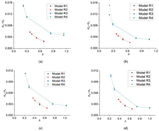 The lateral ultimate strengths of models R1–R4: (a) , (b) , (c) , and (d) .