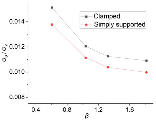 Zhang and Khan [21] presented an empirical formula for calculating the axial compression ultimate strength of a stiffened plate, as shown in Equation (6). Based on this form, Shi [25] derived an empirical formula for evaluating the axial strength of the U-type stiffened plates, as shown in Equation (7). From the formula, we can discover that there are three coefficients selected according to the specific situation. The coefficients in such a form can signify certain characteristic of different models and load cases and it is well worth applying in other situations.