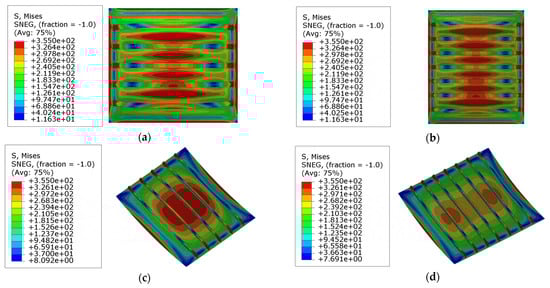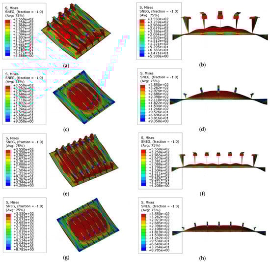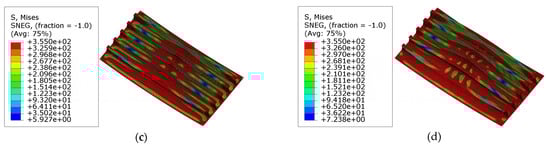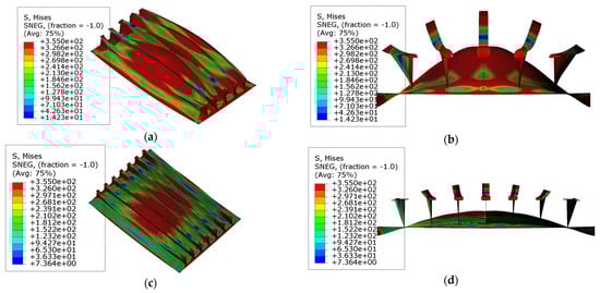 The collapse modes and stress distribution in models ‘R3’ and ‘R4’ with weaker stiffeners are illustrated in Figure 16c,d,g,h. In these models, the global collapse occurs during the loading process. It is because the lateral bearing capacity of stiffeners decreases as the column slenderness ratio increases, resulting in the global buckling collapse mode. As shown in Figure 17c,d, the yielding happens in the areas around the endings of the stiffeners and the center of the plates before reaching the ultimate state. This phenomenon indicates that larger curvature angles also enhance the lateral bearing capacity of the plates, and the yielding of the plates occurs earlier, which differs from the collapse mode observed in models ‘R1’ and ‘R2’.