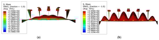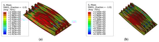 The collapse modes and stress distributions of the models with larger curvature angles are shown in Figure 16. In Figure 16b,f, besides global deformation, the local buckling of plates is also observed. In comparing with the phenomena shown in Figure 14, the amplitude of the global collapse decreases, whereas the area of yielding in the plate expands. Figure 17 shows the stress distribution in model ‘R3T1S1’ and model ‘R4T1S1’ before reaching the ultimate state. It is evident that the global buckling and tripping of the stiffeners occur simultaneously. These phenomena signify that the plates are subjected to stronger constraints in the normal direction, leading to increased participation of the stiffened plates in the loading capacity. In model ‘R3T1S1’ and model ‘R4T1S1’, larger curvature angles enhance the lateral bearing capacity of the stiffeners; hence, stronger normal constraints are applied to the plates. The lateral bearing capacity of the stiffened plates is finally enhanced.