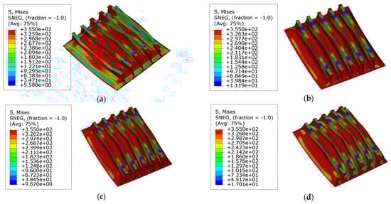 The deformation behaviors and stress distributions of models ‘R3S1’ are shown in Figure 19 and Figure 20. In models with larger curvature angles along the stiffeners, the local buckling of plates becomes more significant as the plate slenderness ratio increases. As the plates become thinner, the local buckling of the plates becomes more severe, and the buckling of plate happens earlier. Consequently, the dominant collapse mode converts into the local buckling of the plates.