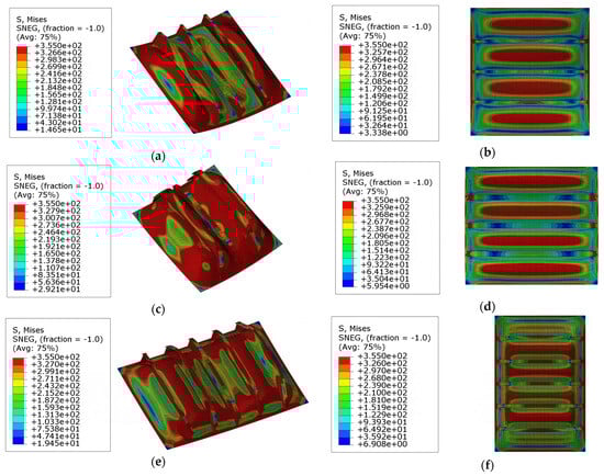 The deformation behaviors and stress distribution of models with larger slenderness ratios of plates are shown in Figure 21. In contrast to the models ‘R1’ and ‘R2’ taken from an ice breaker, these models have larger plate slenderness ratios. Another collapse mode, which is different from the models discussed above, can be observed. Figure 21b,d,f show the stress distribution and deformation behaviors of these models before reaching the ultimate state. From these figures, it can be concluded that the yielding and collapse of both the plate and stiffeners occur almost simultaneously during the lateral loading process of such stiffened plates. As shown in Figure 16a–c, the buckling of plates is quite significant at the ultimate state, and the deformations of stiffeners has also become more severe.