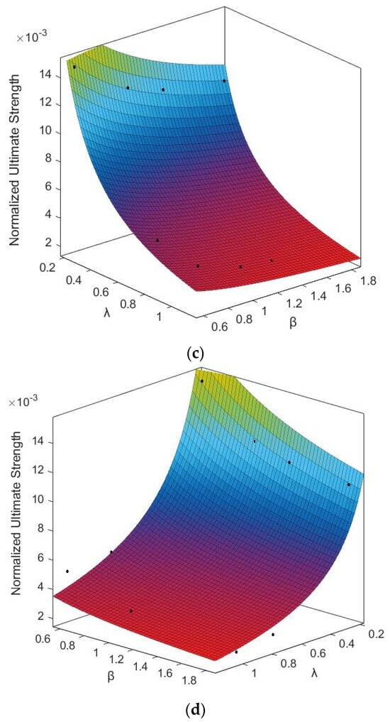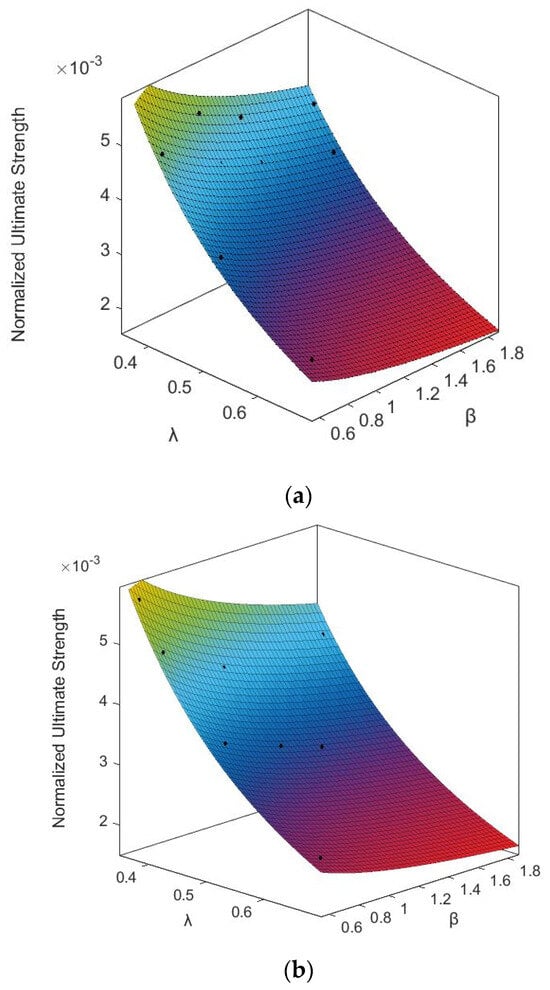 Based on the form of Equation (6), the empirical formula for predicting the lateral ultimate strength of the doubly curved stiffened is expressed as follows. To consider the effect of the curvature in longitudinal and transversal directions, the coefficients are replaced by a series of rational low-order polynomial functions. The basic form of the empirical formula is shown in Equation (8), and functions , , and are expressed in Equations (9)–(11), where the parameters , , and denote the influences of the curvature.