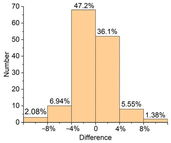 Comparisons with results derived from the formula and the practical NFEM are shown in Figure 22. We can find that the prediction of the formula and the NFEM results match well, with . We can also find that the lateral ultimate strengths of the doubly curved stiffened plates decrease with the increase of the parameters and from the picture; moreover, the difference distribution frequency is shown in Figure 23.