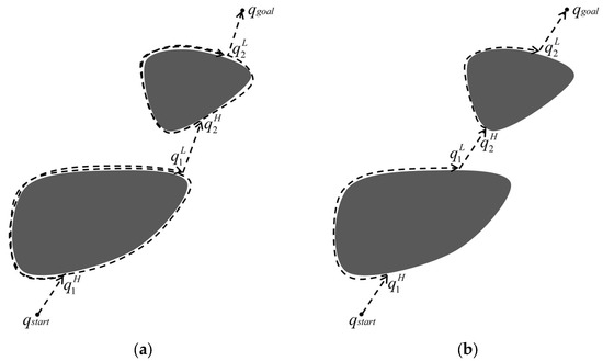 The basic principle of the Bug1 algorithm [16] is that when not encountering obstacles, the shortest path is obtained along the line to the target; when encountering obstacles, it first bypasses the entire border of the obstacle while getting the leave-point, which is the closest position to the target point, then leaves obstacles from the leave-point. The schematic diagram of the Bug1 algorithm is shown in Figure 4a. The process is as follows: