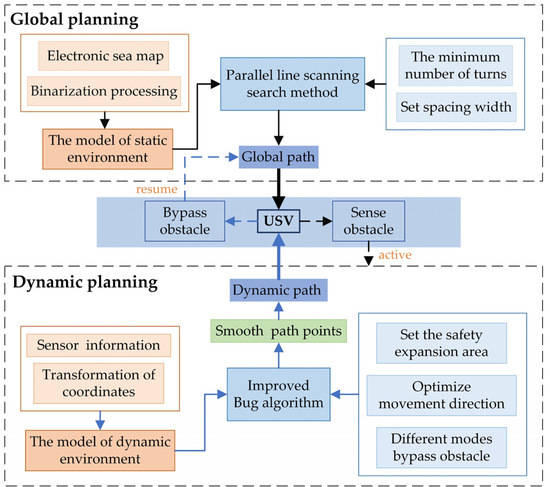The key prerequisite for global path planning is to obtain prior environmental information; on the contrary, local path planning only uses sensor information to achieve obstacle avoidance. Considering the actual environment at sea, it is difficult for USV to complete the search task only relying on global path planning, and it will increase the computing time only by local path planning [15]. Therefore, the main idea of sea search path planning proposed by this paper is to first plan the global path according to the static environment information, and when encountering unknown obstacles, the Bug algorithm is used to plan the local dynamic path according to the sensor detection information.