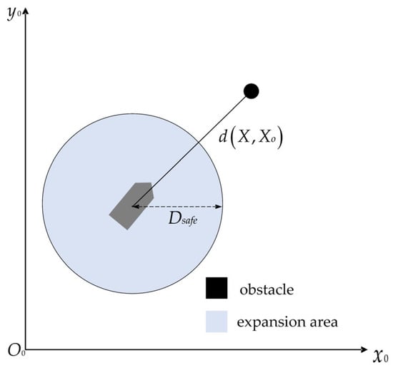 Considering the complex and changeable nature of the actual navigation environment, the USV cannot simply be regarded as a mass point. To ensure the safety of the USV during the process of bypassing obstacles, we set a safe expansion area for the USV to ensure that the distance between the USV and obstacle is always greater than the safety distance , as shown in Figure 7.