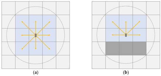 Optimize the movement direction of the USV. (a) the traditional Bug algorithm; (b) the improved Bug algorithm. Grey areas stand for unexplored areas; blue areas stand for detected areas; arrows stand for the movement directions.