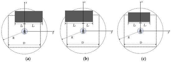The different cases of detecting the border of the obstacle. (a) and > D/2; (b) and > D/2; (c) < D/2 and < D/2.