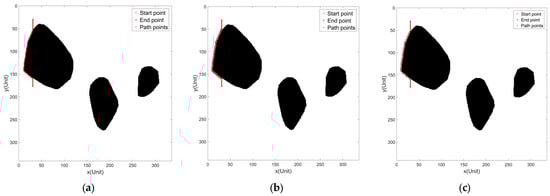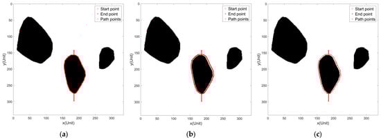 As shown in Figure 9a, the lengths of the obstacle border > and > D/2, in this case, the USV can meet the requirement of area coverage by choosing to bypass the obstacle on the left; as shown in Figure 9b, the lengths of the obstacle border < and > D/2, in this case, the USV can meet the requirement of area coverage by choosing to bypass the obstacle on the right; as shown in Figure 9c, < D/2 and < D/2, in this case, the USV needs to bypass the obstacle for a week to meet search area coverage.