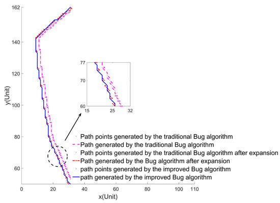 Set the starting point coordinates (185, 143), the end point coordinates (185, 298), and the radius of the safe expansion area of the USV as two units of length. The path length and running time of the traditional Bug algorithm, the Bug algorithm after expansion, and the improved Bug algorithm are shown in Table 5.
