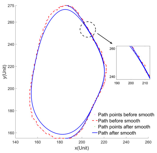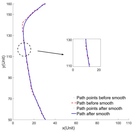 The evaluation indicators of the path smoothness are shown in Table 6. Table 6 shows that the variance and the standard deviation of angles between the road points and the heading angles of USV after path smoothing by the Bezier curve are less than before path smoothing, so the obstacle avoidance process is smoother. The path after smoothing by the Bezier curve conforms to the corner angle restriction of USV, as shown in Figure 18.