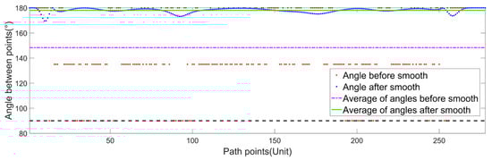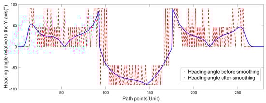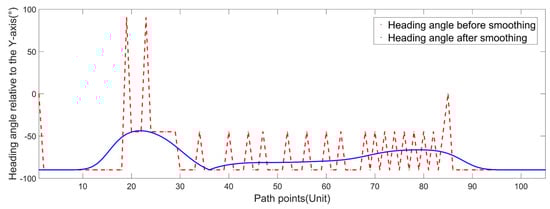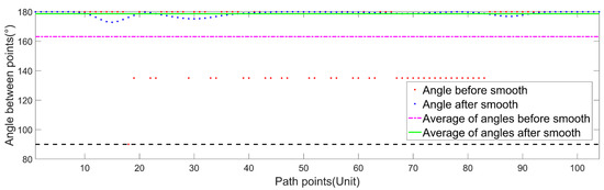 Figure 19 and Figure 20 show that the corner angles of the path points obtained by the improved Bug algorithm are within the [90, 180] range, and the average corner angles before and after smoothing are 148.27° and 177.98°, respectively. The corner angles of the path points after smoothing conform to the corner angle restriction of the USV, and the heading angles of the USV after smoothing change continuously, which is in line with the movement characteristics of the USV.