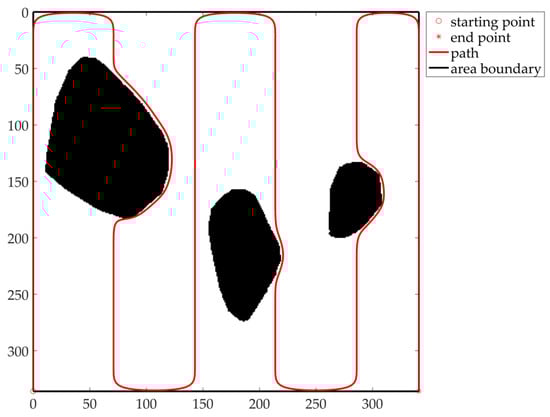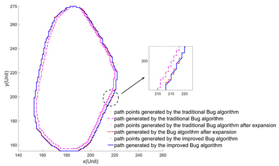 As can be seen from Figure 23, the improved Bug algorithm finds a path from the start point to the end point by moving along the contour boundary of the obstacle. In this paper, the Bezier curve is introduced for path smoothing to solve the problem of oscillation at the boundary of obstacles. The area length of the Bug algorithm mainly depends on the shape and distribution of obstacles, but it can ensure complete coverage of the area, which is fully proved by simulation and comparison experiments.