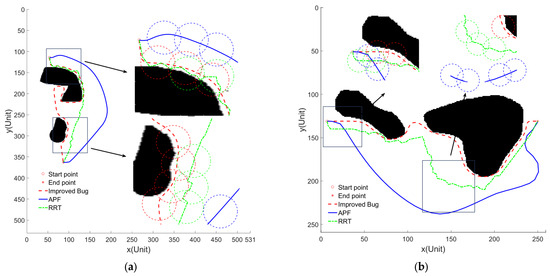 Paths for 3 planners improved Bug, APF, and RRT. (a) environment 1; (b) environment 2.