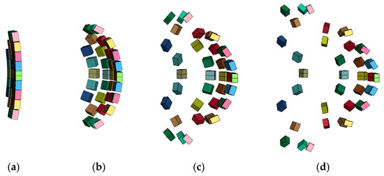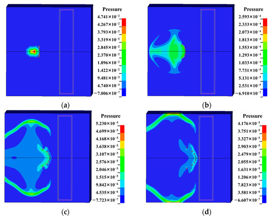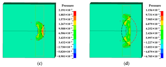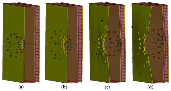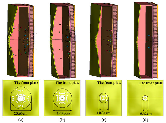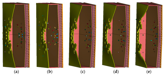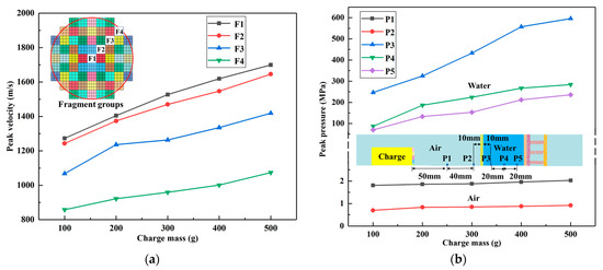 - When all other variables remain constant, the velocity difference between the border fragment and the central fragment increases with increasing charge mass. As the charge mass increases, the explosion wave pressure in the air increases relatively slowly, while the blast wave pressure in the water varies significantly. The damage mode of the multilayer liquid-containing structure is primarily manifested as the expansion of the damage area on the front plate of the liquid tank and as the degree of compression collapse in the honeycomb layer as the charge mass increases. When the charge mass is small, fragments significantly impact the damage mode of the structure. When the equivalent charge mass is large, the damage effect of the blast wave becomes more pronounced.