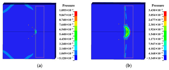 Variations in fluid pressure throughout the process are categorized into two components: air pressure variation and water pressure variation. The evolution of the air pressure is illustrated in Figure 7. At 10 μs, the cylindrical TNT swiftly converts into byproducts of high-temperature and high-pressure detonations. The air is perpetually compressed by the detonation product, which generates an explosion wave. The pressure is greatest at the center of the detonation at this moment. At 30 μs, the pressure at the epicenter of the explosion decreases progressively as the detonation wave propagates. The pressure at the front end of the blast wave is considerably greater than that at the rear end because the blast wave interacts with the fragments and is compressed. The propagation velocity of the blast wave at the front end is considerably slower than that at the rear end because the fragments are propelled. The general shape of the blast wave is a semiellipsoid at this time. At 60 μs, the fragments are propelled forward by the blast wave, and a portion of the blast wave surpasses the fragments. The general shape of the blast wave is apple-like. The propagation speed of the blast wave is considerably greater than that of the fragments during the early stages of the explosion. At 80 μs, the blast wave reaches the front plate of the liquid tank, generating interactions.