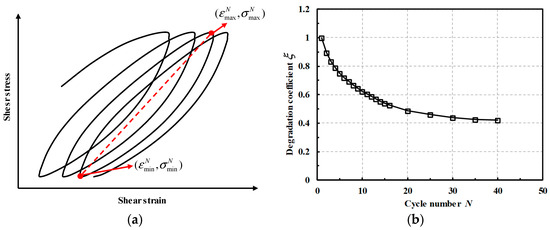 where the superscript represents the number of stress cycles; and are the maximum and minimum axial strain of the Nth cyclic loading, respectively; represents the secant modulus of the Nth cyclic loading curve, as shown in Figure 1.