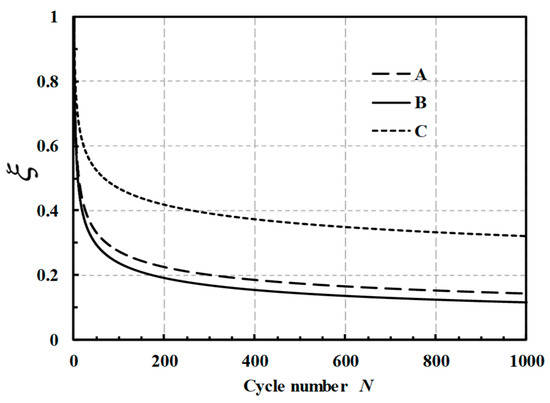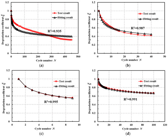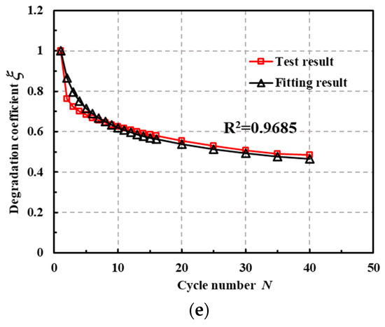 Through the test results, the relationship between the degradation coefficient and the number of cycles under different stress levels was obtained. The relationship between the degradation coefficient and the number of cycles was fitted, as shown in Figure 2.