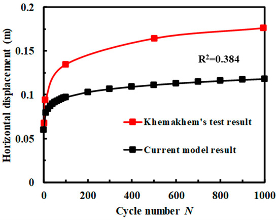 Khemakhem [16] carried out several centrifugal model experiments of piles under cyclic load in kaolin foundations. The unidirectional sinusoidal cyclic loading was used. The total number of cycles was 1000. As shown in Figure 4, the evolution of the pile top displacement calculated in this work was compared with the test results. It can be observed that compared with the test results, the pile top displacement calculated in this work is smaller, but the overall developmental trend is consistent. This is because the parameters of this model are based on the dynamic triaxial tests of the undisturbed South China Sea clay sample. Compared with the reconstituted kaolin, the undisturbed South China Sea marine clay has a stronger structure, which may be the reason why it is relatively insensitive to cyclic loading.