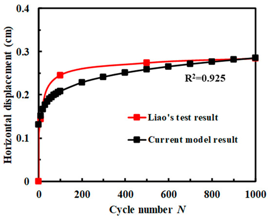 Liao et al. [5] conducted several horizontal cyclic loading model tests of a single pile in in situ marine soft clay. The one-way cyclic loading method was used. A total of 5000 cycles were loaded in the test. Considering the computational cost and efficiency, a total of 1000 cycles were calculated in this work. As shown in Figure 5, the change in the pile top displacement with the number of cycles calculated in this work was compared with the test results. At the initial stage of loading, the calculation results are slightly lower than the test results. In general, the calculated results are in good agreement with the experimental results, indicating that the model used in this work can reasonably reflect the response of marine soft clay under long-term cyclic loading.