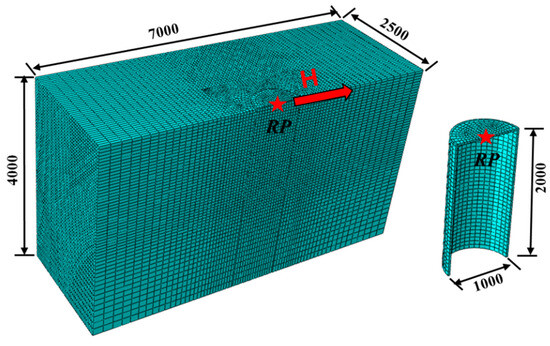 The contact interface of the soil in the cylinder was set to be rough and bonded to reflect the negative suction [18,22,23]. The friction contact was adopted for other contact interfaces. The friction coefficient was set to = 0.55 [24]. It is assumed that the suction pile was embedded in the foundation in advance, and the in situ stress balance operation was carried out to eliminate the vertical displacement caused by self-weight. The horizontal cyclic loading was applied to the reference point (RP) of the top surface of the suction pile.
