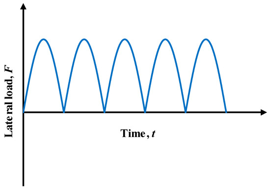 Cyclic loading methods are usually one-way or two-way cyclic loading. For offshore foundations, horizontal cumulative displacement is a design control factor. Considering that one-way cyclic loading will produce greater displacement accumulation [25,26,27], this work adopted a one-way cyclic loading model (Figure 7) to simulate the most unfavorable conditions of displacement accumulation. The cyclic loading frequency was 0.1 Hz.