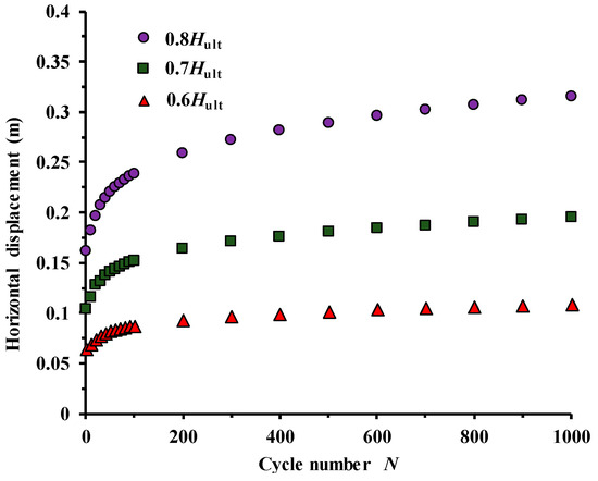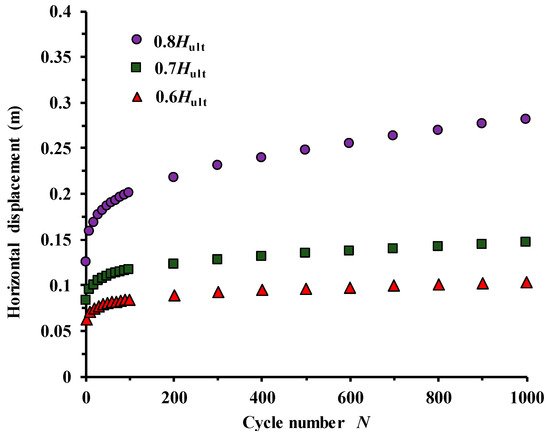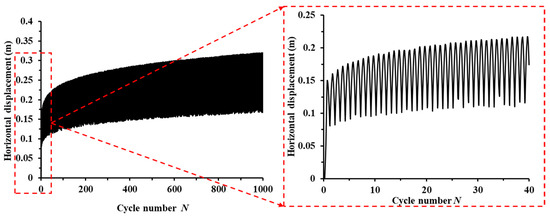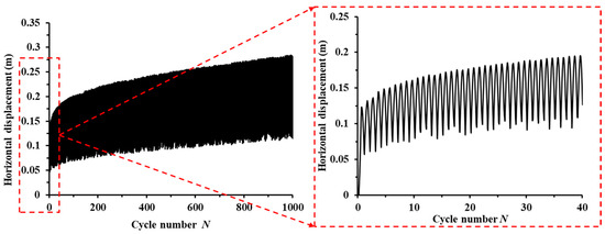 Figure 8 shows the evolution curve between the horizontal displacement of the single-cylinder suction pile top and the number of cycles under the horizontal cyclic loading of 0.8 Hult. The total number of cycles was 1000. As shown in the figure, the cumulative horizontal displacement of the pile top developed rapidly at the initial loading stage. After 100 cycles, the cumulative horizontal displacement of the pile top was about 0.18 m. With the increasing number of cycles, the growth rate of the cumulative displacement gradually slowed down. After 1000 cycles, the cumulative horizontal displacement of the pile top was about 0.27 m.