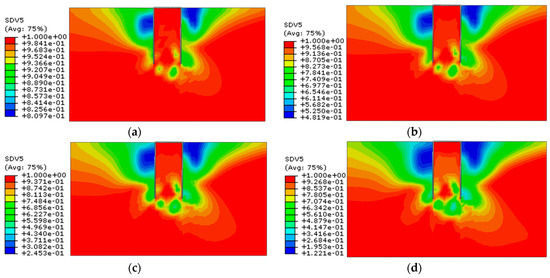 Figure 9 shows the degradation coefficient of soil under different cycles. The view plane is the pile diameter section plane along the direction of the horizontal cyclic loading. In the legend, SDV5 is the degradation coefficient of soil stiffness mentioned above. It can be seen from the figure that in the process of cyclic loading, different soil elements had different degrees of degradation due to the different stress levels of the soil near the pile body. With the increase in the number of cycles, the degradation coefficient decreased gradually, and the degradation degree and area increased gradually. Under the action of a horizontal cyclic load, the soil on the passive side of the pile body appeared to experience stiffness degradation first. After 1000 cycles, the minimum degradation coefficient was about 0.12. In addition, with the increase in the number of cycles, the degradation area of the pile end and the internal soil of the suction pile expanded gradually, which developed from the pile end to the inside of the pile.
