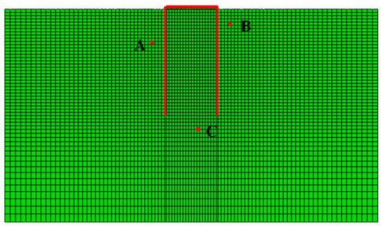 The FE model of the single-cylinder suction pile foundation was established as shown in Figure 6. The diameter and the wall thickness of all models was set to 10 m and 25 mm respectively, which is the usual size of a steel cylinder foundation [17]. The whole system was modeled using a semi-structured method, and the symmetric boundary was applied on the symmetric plane. The vertical and horizontal displacements were constrained by the bottom boundary of the soil, while the horizontal displacement was constrained by the side boundary [18]. The three-dimensional hexahedron eight-node complete integral element was used, which is widely used in the relevant finite element numerical calculation [19,20,21]. Based on the mesh size sensitivity analysis, the minimum size of the element was determined to be 0.1 D. The mesh size at the edge of the model increased slightly to improve the computational efficiency. The total number of elements was about 80,000.
